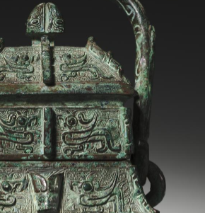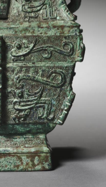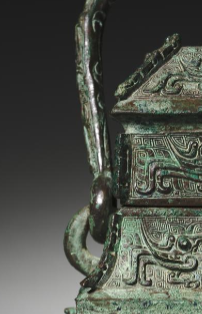 本品规格为26.7 x 13.4 厘米。以青铜为材质,整体造型庄重典雅。器身呈方形,有盖,盖顶有钮,方便开启。两侧有精美的提梁,提梁上装饰有纹饰,与器身纹饰相呼应,便于提携。器身布满兽面纹,兽面威严神秘,线条流畅且富有张力,细节刻画精致,展现出商代青铜器高超的铸造工艺。青铜表面因岁月沉淀,呈现出古朴的绿锈色泽,更添历史厚重感。