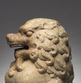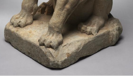 本品规格为49.6 x 41.8 厘米,高度78.8厘米,重量197.313千克。它呈蹲坐姿态,身躯健硕,肌肉线条通过石雕技艺被有力地刻画出来,充满力量感。头部鬃毛卷曲,呈涡旋状,层次丰富,彰显出工艺的精细。面部神情威严,双目圆睁,嘴巴大张,似在怒吼,传递出威慑之感。四肢粗壮,稳稳地支撑着身体,爪子造型写实,紧紧抓附于方形基座之上,基座质朴厚重,与狮子的威武形成呼应,整体展现出唐代石雕艺术中对力量与威严的追求,是唐代石雕艺术的典型代表之一。