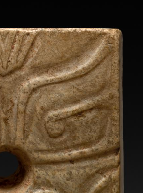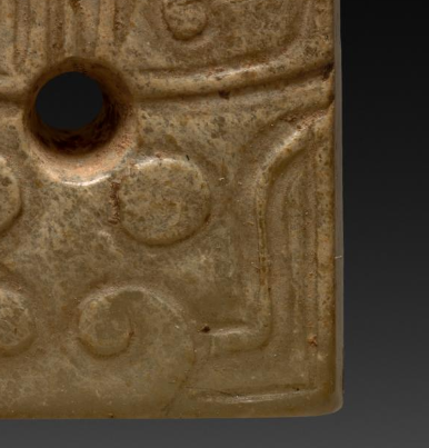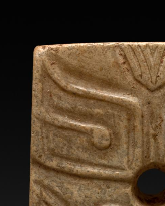 本品规格为2 x 1.7 厘米。以玉石为材质,整体呈方形。器身雕刻有精美的兽面纹饰,线条流畅且富有张力,兽面的眼部、鼻部等细节刻画细致,营造出威严神秘的氛围。中间有一圆形穿孔,既便于穿系,也为器物增添了造型上的节奏感。玉石表面带有岁月留下的古朴质感,色泽温润,整体工艺精湛,体现了西周时期玉器制作的高超技艺,不仅是实用的兵器或礼器,更是兼具艺术价值与历史文化价值的珍贵文物,反映出当时的审美观念与工艺水平。