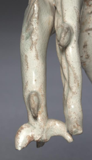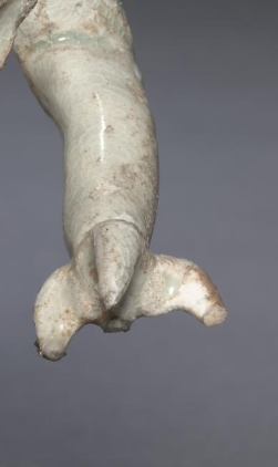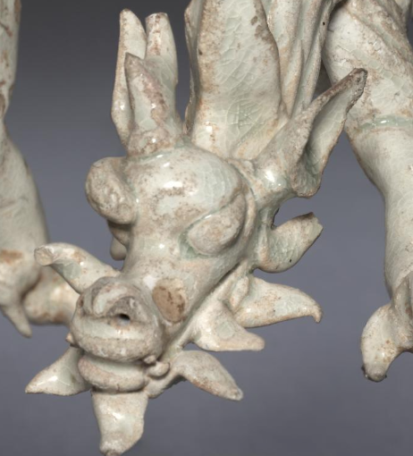 本品规格为5.2 厘米。整体以龙为造型,龙身呈弯曲的拱状,姿态矫健灵动。龙首雕刻细致,双目、龙角等部位特征鲜明,尽显威严。龙身布满尖刺状凸起,增添了立体感与力量感。通体施青白釉,釉色白中泛青,温润雅致,不过因岁月等因素,釉面有部分磨损、污渍痕迹,却也更显古朴沧桑。它可能曾作为装饰构件或文房等场所的陈设品,展现出元代瓷器雕塑工艺的特色与水平。