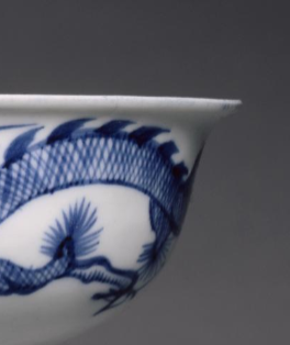 本品规格为直径13.3 厘米,高度11.8厘米。碗体上部呈敞口状,线条舒展流畅;下部连接修长的高足,高足带有竹节般的纹路,增添了器物的层次感与韵律美,整体比例协调,尽显端庄大气之态。碗身以青花为饰,绘制的龙纹尤为精美。龙纹姿态矫健,龙身蜿蜒灵动,龙鳞刻画细致入微,青花色泽浓艳明快,蓝色的龙纹在洁白的釉面衬托下,显得栩栩如生、气势磅礴,仿佛正腾云驾雾,极具艺术感染力。