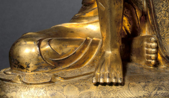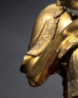 本品规格为44.2 x 31.8 厘米。整体以铜为胎,表面鎏金,色泽璀璨夺目,历经岁月仍具华贵质感。罗汉呈坐姿,神态悠然,面部刻画细腻,眉眼微阖,似在沉思或观照内心,胡须等细节生动,尽显古朴神韵。身着的袈裟纹饰精美,线条流畅自然,衣褶的起伏与垂落都被精准塑造,将织物的质感与动态完美呈现。他的肢体姿态放松且具韵律,一手搭于膝上,一手自然放置,与身下雕刻有精致纹样的座台相呼应,整体造型既体现出宗教造像的庄严神圣,又通过细腻的工艺与生动的神态,传递出罗汉沉静、超脱的气质,是元代铜造像艺术中兼具艺术价值与宗教内涵的精品,反映了当时高超的金属铸造与鎏金工艺水平,以及对佛教人物形象的独特艺术诠释。
