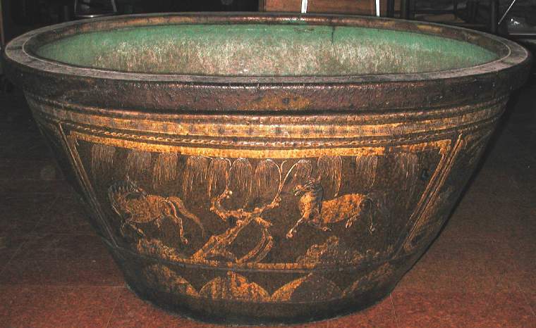 细节:盆身外部装饰有精美的花鸟、走兽图案,如公鸡、花卉以及奔跑的骏马等,图案以开光的形式分布,线条流畅,形象生动,展现了清代工匠较高的绘画和装饰技艺。器物表面有一些细微的磨损、锈迹以及彩绘脱落的痕迹,显示出其经历了长时间的流传。