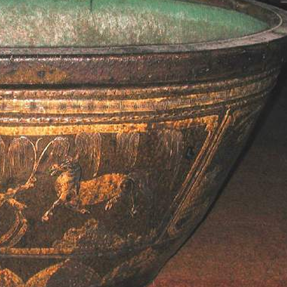 材质与色泽:主要材质为铜,经过岁月侵蚀,外部呈现出深沉的棕褐色。盆内壁呈现出绿色,可能是铜锈或者经过特殊处理的效果。外部以彩绘工艺装饰,色彩有金色等,虽历经岁月有所磨损,但仍能看出其曾经的精美。