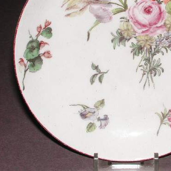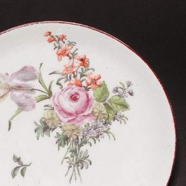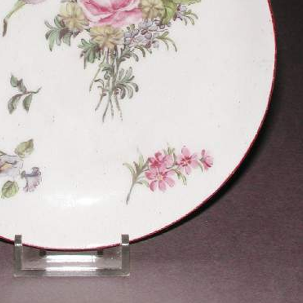 细节:盘心以粉彩描绘一束盛开的花卉,包括玫瑰等,花朵形态逼真,花瓣层次分明,周围点缀着一些小花和绿叶,布局疏密得当。盘面上还零散分布着几处小型花卉枝叶图案,增加了画面的丰富性。器物表面有一些细微的磨损、小的划痕以及釉面细小的开片现象,显示出其经历了长时间的流传。