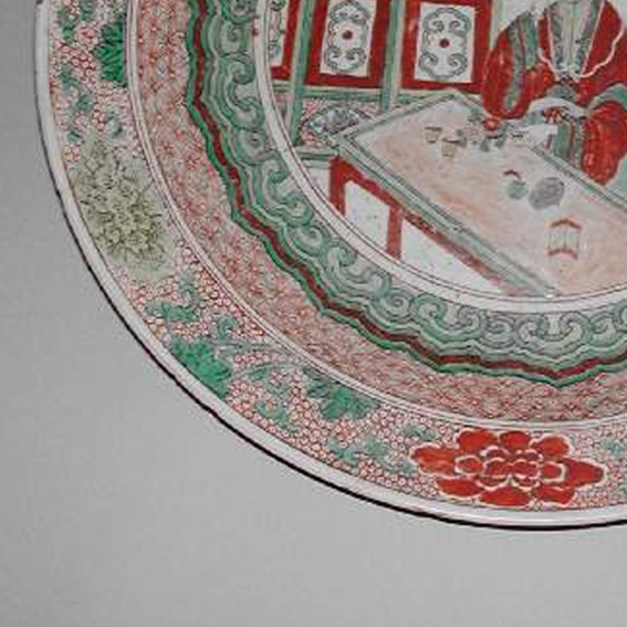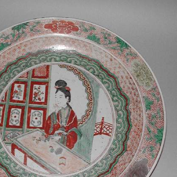 细节:盘心以五彩描绘一位仕女,仕女身着传统服饰,盘发造型,神态悠然,似在桌前进行某种活动,周围衬以室内窗格、桌案等场景,增加了画面的故事性。盘边缘装饰有连续的花纹图案,包括云纹、几何纹等,布局严谨,绘制精细,体现了清代工匠较高的绘画和装饰技艺。器物表面有一些细微的磨损、小的划痕以及釉面细小的开片现象,显示出其经历了长时间的流传。