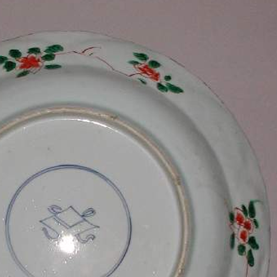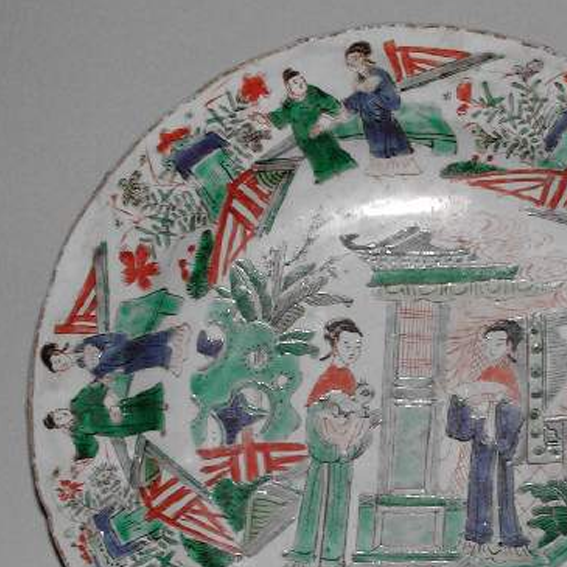 细节:盘心以五彩描绘人物故事场景,人物众多,神态各异,身着传统服饰,活动于亭台楼阁、花草树木之间,画面富有故事性。盘边缘装饰有花卉等图案,与盘心的人物故事图案相呼应,布局严谨,绘制精细,体现了清代工匠较高的绘画和装饰技艺。器物表面有一些细微的磨损、小的划痕以及釉面细小的开片现象,显示出其经历了长时间的流传。