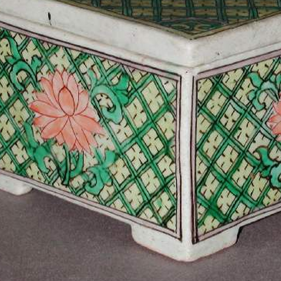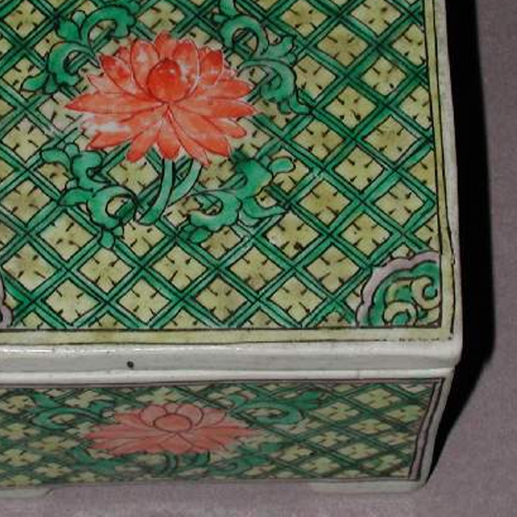 细节:盒盖及盒身四面均装饰有莲花纹,莲花造型优美,花瓣层次分明,周围环绕着绿色的花叶和网格状的底纹,网格纹线条规整,莲花纹与网格纹相互映衬,体现了清代工匠较高的装饰技艺。器物表面有一些细微的磨损和釉面老化痕迹,显示出其经历了长时间的流传。