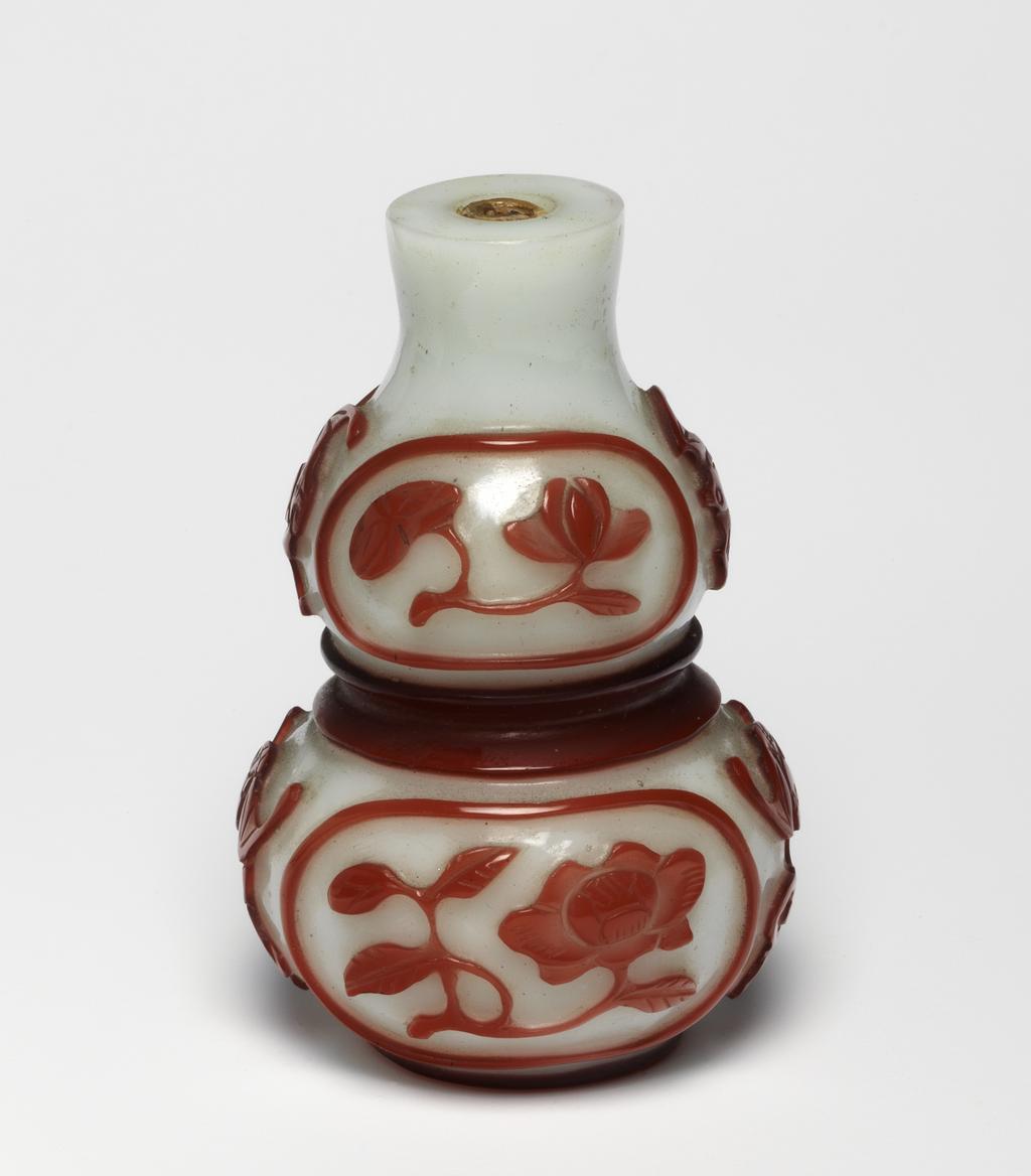 整体造型:呈葫芦形,由上下两个相连的球体组成,上小下大,小口短颈,整体造型圆润可爱,符合传统葫芦的形态,便于握持和携带,是清代常见的鼻烟壶造型之一。