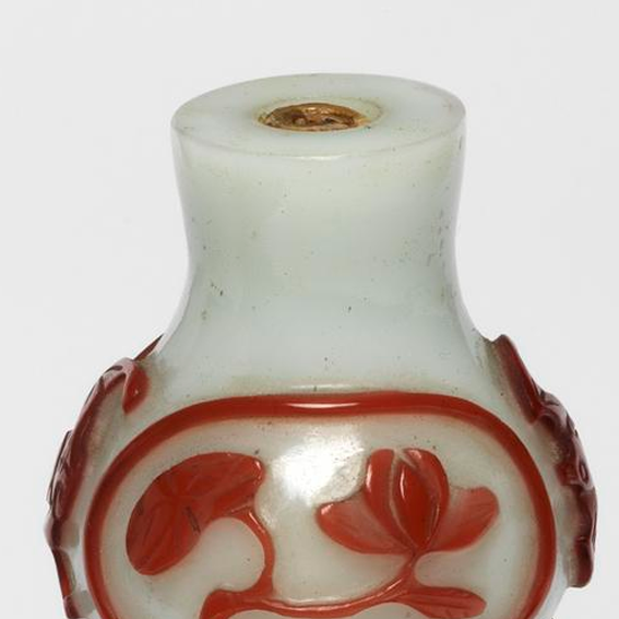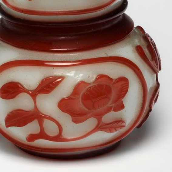 细节:在红色玻璃层上雕刻有多种图案,上半部分雕刻有蝙蝠、花叶等纹饰,蝙蝠在中国传统文化中有 “福” 的寓意;下半部分雕刻有花卉等图案,花朵形态优美,花叶线条流畅,雕刻工艺精湛,纹饰布局合理,体现了清代工匠高超的雕刻技艺。壶口处较为规整,内部中空,用于盛装鼻烟。