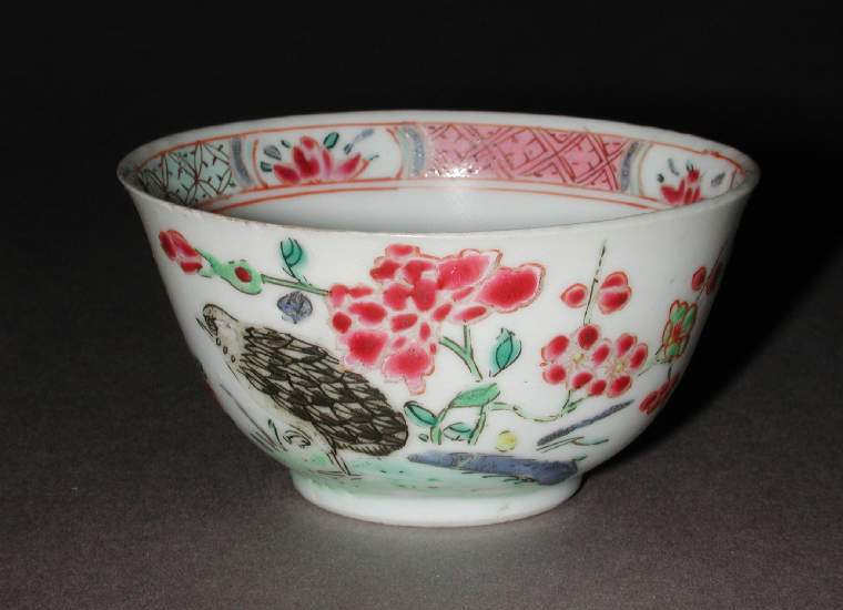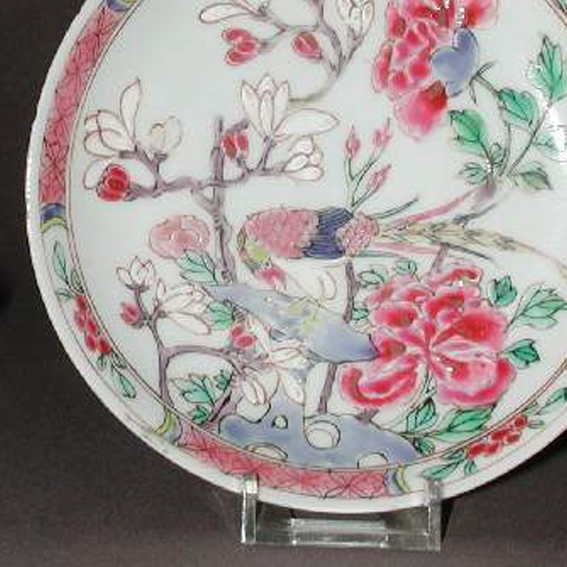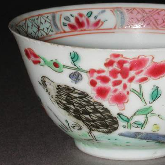 细节:碗的外壁以粉彩描绘了花鸟图案,花朵绽放,色彩明艳,如红色的牡丹等,鸟儿姿态各异,羽毛细节刻画入微,生动活泼;碗口沿内侧也有花纹装饰,增加了器物的精致感。碟的盘面同样以粉彩绘制花鸟纹饰,枝头花朵盛开,鸟儿栖息或飞翔,周围衬以枝叶,布局合理,绘制精细,体现了清代工匠高超的绘画技艺。器物表面有一些细微的磨损、小的划痕以及釉面细小的开片现象,显示出其经历了长时间的流传。