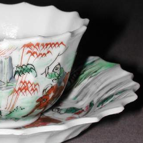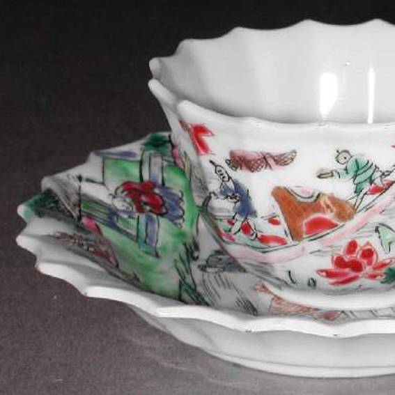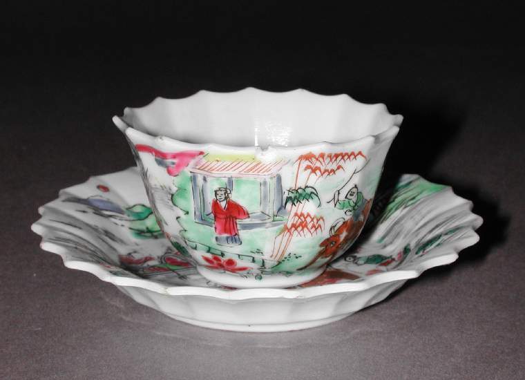 细节:碗和碟的表面以五彩描绘了丰富的人物故事场景,如渔舟唱晚、文人雅趣等画面。人物形象生动,身着传统服饰,神态各异,动作栩栩如生;周围衬以山水、花卉、亭台楼阁等元素,布局合理,绘制精细,体现了清代工匠较高的绘画和装饰技艺。碗口沿和碟边缘有细微的磨损痕迹,以及一些细小的釉面开片现象,显示出其经历了长时间的流传。