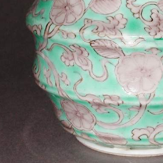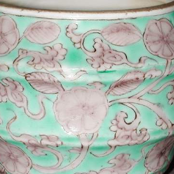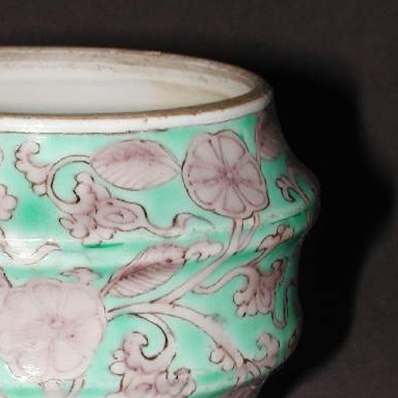 材质与色泽:胎体选用的瓷土细腻,烧制后质地坚硬。外壁施绿釉,釉色温润柔和,仿佛初春新叶的颜色,给人清新之感;以紫彩绘制缠枝花卉纹饰,紫彩虽历经岁月,仍能看出其沉稳而典雅的色调,与绿釉相互映衬,颇具韵味。