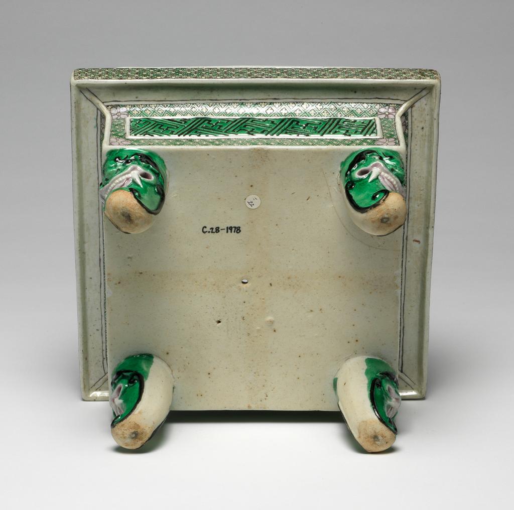 材质与色泽:瓷质细腻坚硬,胎体厚重。施釉均匀,釉面光洁。以绿、紫、白等多种色彩进行装饰,色彩搭配和谐又富有层次感。绿色主要用于兽足、部分纹饰边框等,紫色用于狮子的毛发等部位,白色作为底色,衬托出彩绘纹饰的艳丽。