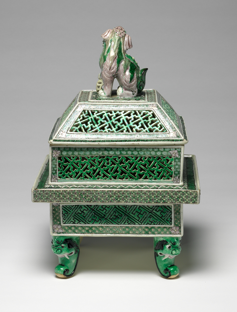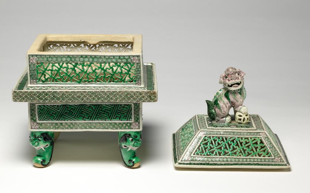 清代,随着社会经济的繁荣,文化艺术也得到了极大的发展,制瓷业达到了一个新的高峰。康熙、雍正、乾隆时期,官窑瓷器制作精益求精,五彩瓷作为重要的瓷器品种,在明代五彩的基础上不断创新。当时,熏香文化在社会各阶层广泛流行,无论是宫廷还是民间,都喜欢使用香薰来改善室内气味、营造氛围。香薰的造型和装饰也越来越多样化,融入了许多传统文化元素,如狮子在中国文化中象征着吉祥、辟邪,镂空工艺则既满足了实用需求,又体现了高超的制瓷技艺,反映了清代人们对生活品质和艺术审美的追求。