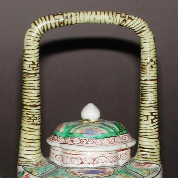 材质与色泽:瓷质细腻,白釉底色纯净。五彩颜色丰富,有红、绿、蓝、紫等色,虽历经岁月,部分色彩略显黯淡,但仍能看出昔日的艳丽。提梁部分呈现出类似竹木的黄褐与浅绿相间色泽,与瓷身的五彩形成对比。