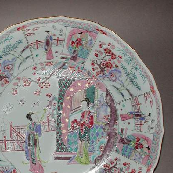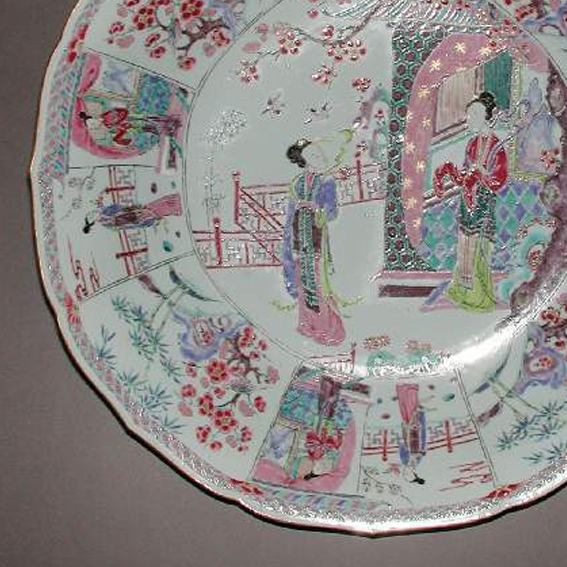 细节:盘心以粉彩描绘了仕女图,几位身着华丽服饰的仕女姿态优雅,或漫步、或交谈,周围衬以亭台楼阁、花卉树木等景致,营造出古典雅致的氛围。盘边缘装饰有花卉纹,花朵形态各异,枝叶线条流畅,绘制精细。器物表面有一些细微的磨损和釉面细小的开片现象,显示出其经历了长时间的流传。