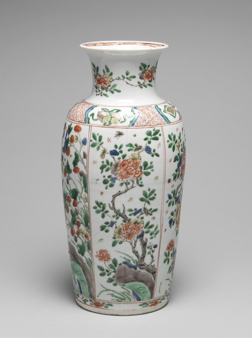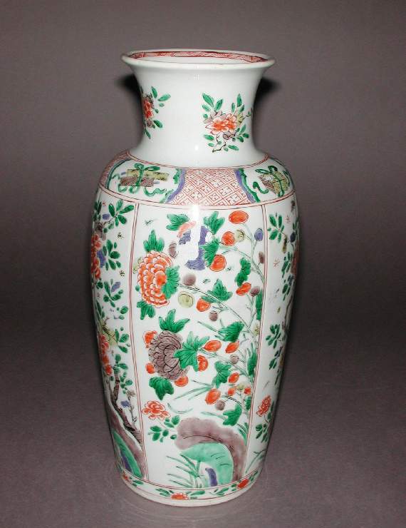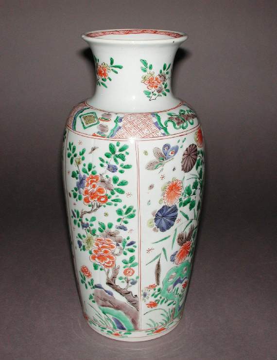 细节:瓶身以五彩描绘了各种花卉,有雍容华贵的牡丹、清新淡雅的兰花、娇艳欲滴的桃花等,花卉形态逼真,花瓣层次分明,花蕊刻画细致,仿佛能闻到阵阵花香。花枝、绿叶穿插其间,布局疏密得当,展现出勃勃生机。此外,瓶口和瓶底边缘处还装饰有精致的几何纹和花卉边饰,进一步增添了器物的精致感。经过岁月的洗礼,瓶身表面有一些细微的磨损痕迹和细小的釉面开片,见证了其颠沛流离的历史。