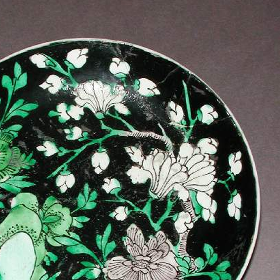 清代是中国瓷器发展的鼎盛时期,制瓷工艺在前代基础上不断创新和完善。墨地三彩是清代康熙时期创烧的一种独特瓷器品种,它以黑色釉为地,再用绿、黄、紫等彩色描绘纹饰,色彩对比强烈,艺术效果独特。康熙、雍正时期,社会相对稳定,经济繁荣,为制瓷业的发展提供了良好的条件。花卉纹作为中国传统瓷器装饰的重要题材,在清代瓷器上广泛应用,不仅具有装饰性,还蕴含着丰富的吉祥寓意,如牡丹象征富贵,梅花寓意高洁等,反映了当时人们对美好生活的向往和追求。同时,清代瓷器大量出口,墨地三彩瓷器以其独特的艺术风格受到海外市场的关注,成为中外文化交流的重要载体。