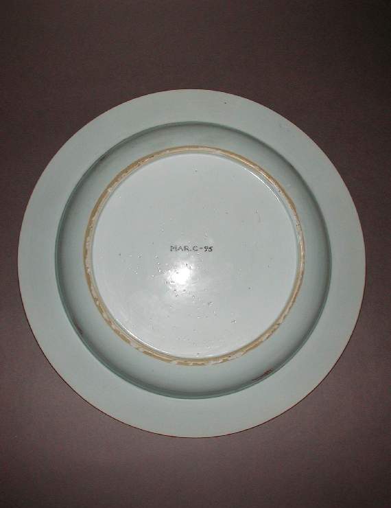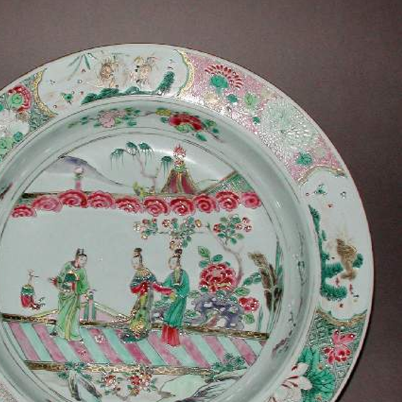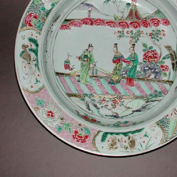 细节:盘心绘有三位身着传统服饰的仕女,她们姿态优雅,或交谈,或赏景,神情生动,衣纹线条流畅,展现出清代女性的柔美。周围衬以庭院景致,有盛开的花卉、葱郁的树木、曲折的栏杆等,细节丰富,仿佛将一个静谧雅致的庭院场景浓缩于盘中。盘的边缘装饰有精美的花卉和吉祥图案,色彩鲜艳,布局疏密有致,进一步增添了器物的美感。器物表面有一些细微的磨损痕迹,显示出其经历了漫长的岁月流转。