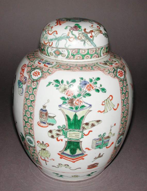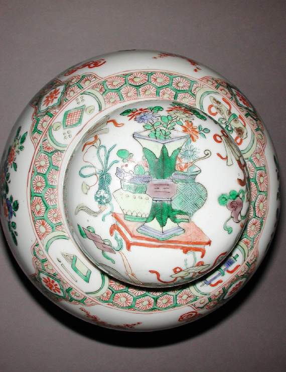清代康熙、雍正时期,制瓷业繁荣,五彩瓷工艺在明代基础上进一步发展,色彩运用更加丰富,绘制更为精细。开光纹饰是清代瓷器常见的装饰手法,通过划分不同区域展现多样题材。仕女题材反映了当时对女性柔美形象的审美追求,博古纹则体现了对古代器物文化的推崇与喜爱,这些纹饰共同反映了清代的社会文化风貌和工艺水平。同时,清代瓷器大量出口,此类精美的五彩盖罐也成为中外文化交流的载体,向世界展示中国制瓷工艺的精湛。