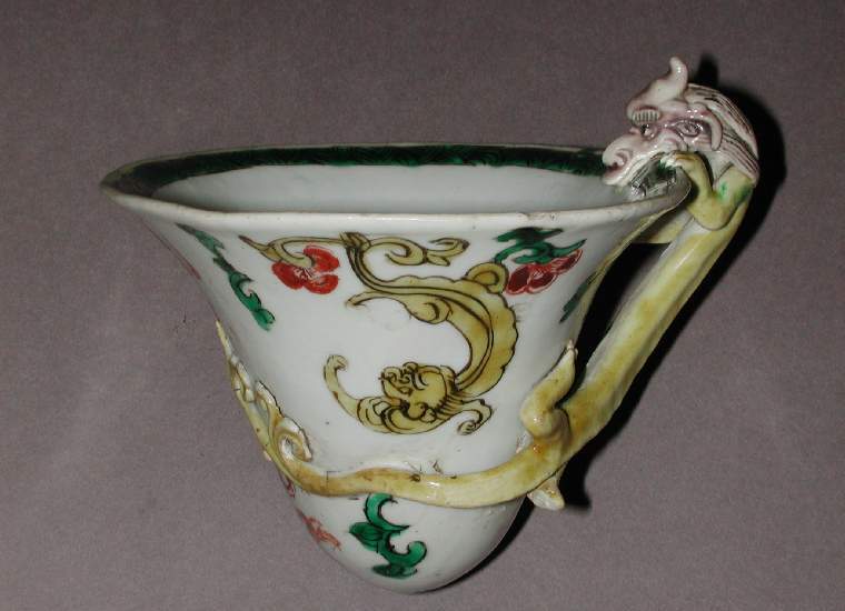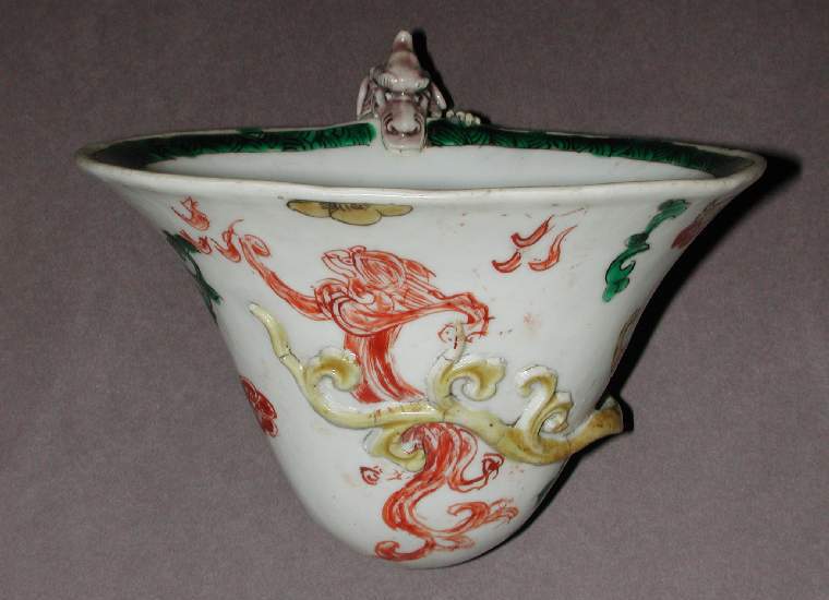 清代是中国瓷器发展的繁荣时期,五彩瓷工艺在继承前代的基础上继续发展。螭龙作为中国古代神话传说中的神兽,常被用于瓷器装饰,体现了人们对祥瑞的向往。同时,清代文房及宴饮器具讲究工艺与装饰的结合,此类带有精美纹饰和独特造型的杯子,不仅是实用器具,也是工艺精品,反映了当时的工艺水平和文化审美。这一时期的瓷器及木雕工艺品也大量出口,成为中外文化交流的载体,向世界展示中国的传统工艺和文化内涵。
