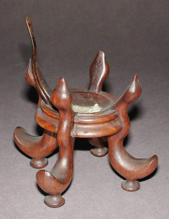 细节:杯身绘有螭龙纹,螭龙形态灵动,线条流畅,周围辅以花卉等纹饰,工艺较为精湛。螭龙形柄雕刻细致,龙头栩栩如生,与杯身的彩绘纹饰相呼应。木质底座的足部雕刻有优美的曲线,工艺细腻,展现出较好的木雕技艺。器物表面有细微的磨损和使用痕迹,见证了它的历史流转。