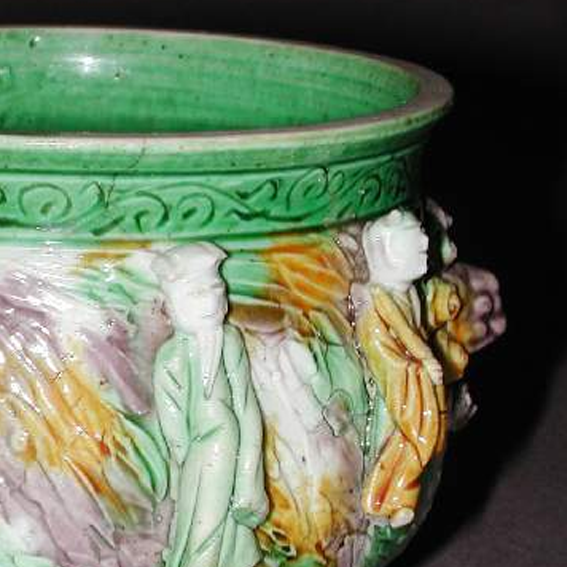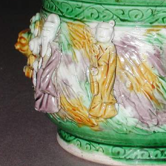 细节:炉身以堆塑和彩绘相结合的方式,塑造了八仙人物形象,八仙姿态各异,神情生动,服饰的纹理和色彩变化丰富,展现出工匠高超的技艺。在八仙人物之间,还装饰有卷云纹等图案,增加了画面的层次感。炉身中部有类似兽面的装饰,周围环绕着卷曲的花纹,增添了器物的神秘色彩。器物表面有一些细微的磨损痕迹和釉面开片,显示出其经历了漫长岁月的洗礼。