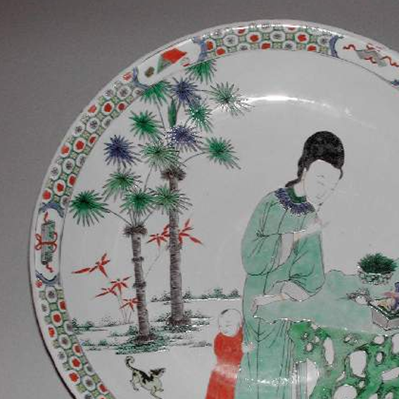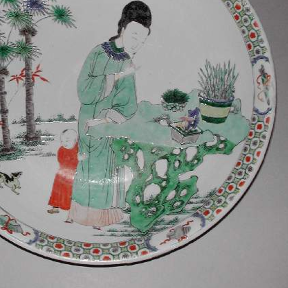 细节:盘心绘有仕女童子图,仕女身着绿色长袍,姿态优雅,似乎正在专注于案台上的事物,童子身穿红衣立于一旁 ,天真可爱。周围衬以松树、竹子、盆栽等景致,营造出宁静雅致的氛围。盘口边缘装饰有连续的几何纹和花卉纹,线条精细,色彩搭配和谐,增添了器物的精致感。器物表面有一些细微的磨损痕迹,见证了岁月的沧桑。