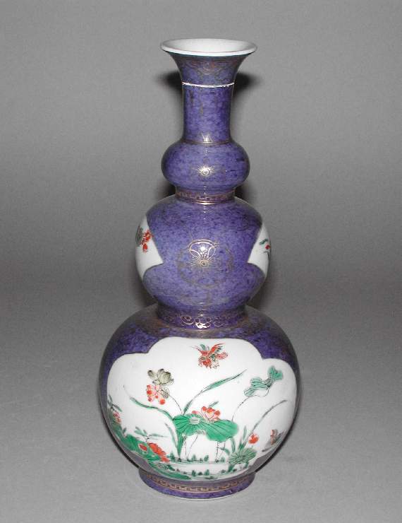 整体造型:为葫芦瓶,由上小下大两个球体组成,瓶口较小,呈喇叭状,瓶身线条流畅,造型别致,具有传统葫芦瓶的吉祥寓意与优美形态。