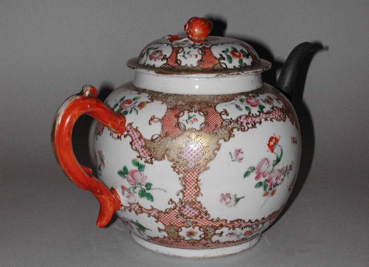 细节:壶身绘有精美的花卉纹,花朵形态各异,枝叶舒展,色彩鲜艳,描金的边框和纹饰线条精细,工艺精湛。壶盖顶部的桃形钮造型逼真,周围也有花卉和描金装饰。执柄为红色,造型优美,与壶身的色彩和纹饰相协调。壶底有一些磨损痕迹,见证了岁月的流转,同时也能看到收藏编号等信息。