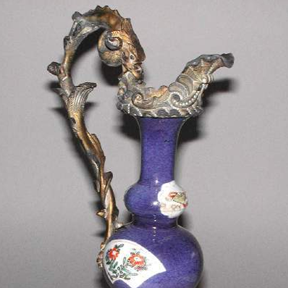 清代是中国瓷器发展的繁荣时期,各种创新工艺不断涌现,洒蓝釉在清代康熙时期创烧,后延续使用。粉彩工艺在雍正、乾隆时期达到鼎盛,常用于绘制花卉等题材。同时,清代对外贸易交流增多,西方对中国精美瓷器喜爱有加,这件执壶融合了多种工艺,还镶有铜饰,可能是为迎合西方审美而制作的外销精品,反映了清代瓷器工艺的精湛、创新以及中外文化交流与贸易对瓷器制作的影响。