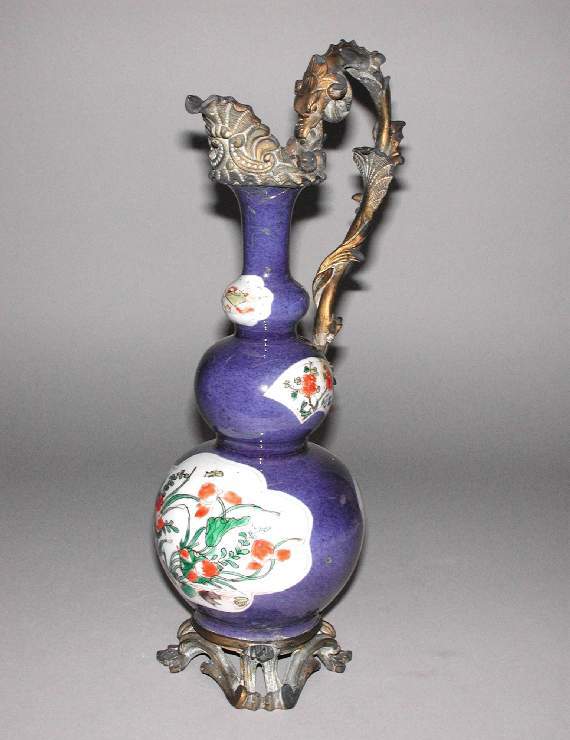 洒蓝釉开光粉彩花卉纹镶铜龙柄葫芦形执壶