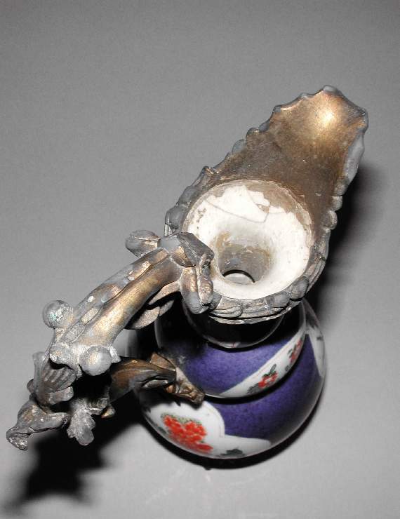 细节:壶身有开光,内绘花卉纹,花朵枝叶舒展,色彩鲜艳,工艺精细。铜质龙柄造型精美,龙的形态栩栩如生,口沿及底足的铜饰也有精致的花纹雕刻。瓶体表面有一些因岁月和流转产生的细微磨损痕迹,见证了其历史沧桑。