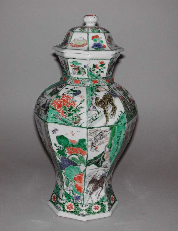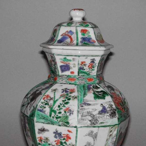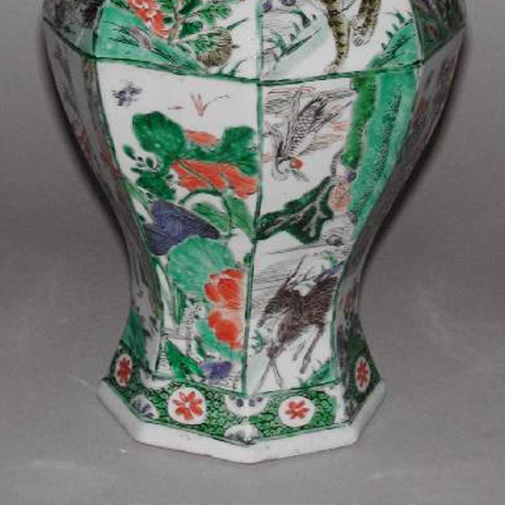 清代是中国瓷器发展的繁荣时期,五彩瓷工艺在清代得到进一步发展,常用于绘制丰富多样的题材,人物纹和花鸟纹是常见的装饰内容,反映了当时人们的生活场景与对自然美的追求。六方盖罐的造型在清代瓷器中较为常见,体现了当时对规整、对称美学的追求,同时也具有一定的实用性。这件五彩开光人物花鸟纹六方盖罐融合了五彩瓷的工艺与丰富的纹饰内容,反映了清代瓷器工艺的精湛与文化艺术的繁荣,也是当时社会生活与审美观念的体现。
