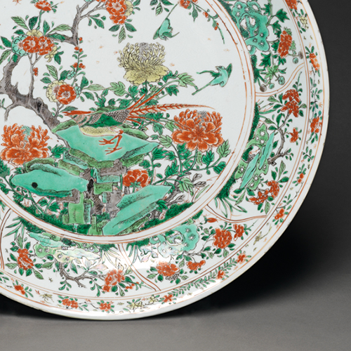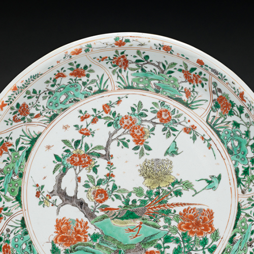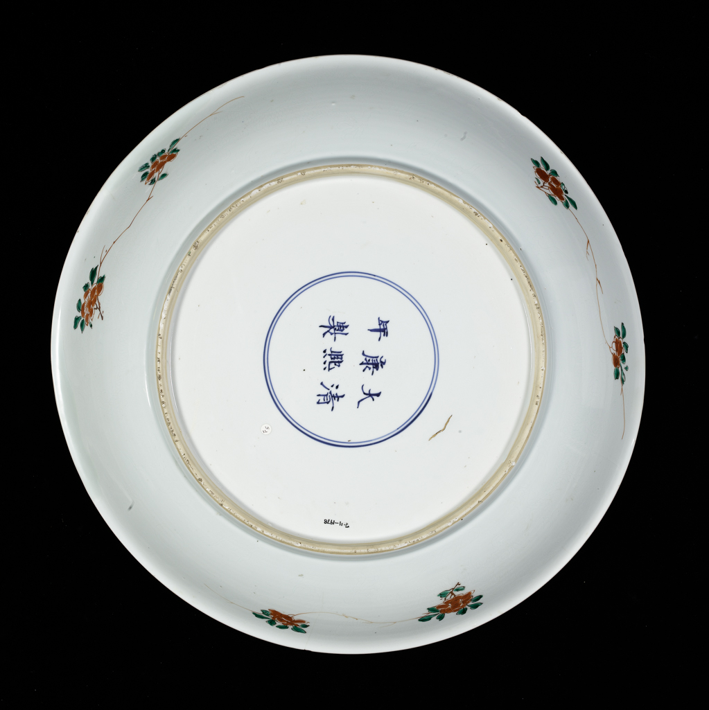 康熙年间是清代瓷器发展的重要阶段,五彩瓷在明代五彩的基础上得到进一步发展和创新。此时的五彩瓷色彩更加丰富,绘制技艺更为精湛,题材广泛,花鸟纹是常见的装饰题材之一。康熙五彩以其强烈的色彩对比和精湛的绘画技艺著称,代表了当时制瓷工艺的高超水平。同时,清代瓷器大量出口,此类五彩花鸟纹盘不仅在国内备受喜爱,也远销海外,成为传播中国文化和制瓷技艺的重要载体,反映了当时中西方文化交流与贸易的繁荣景象。