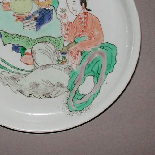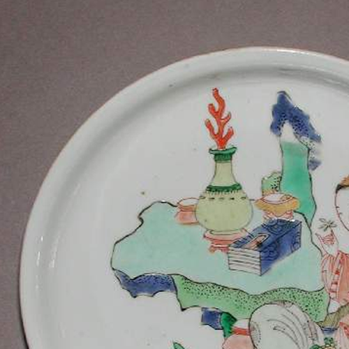 细节:盘心绘有一位身着传统服饰的仕女,神态娴静优雅,正手持花枝,似在轻嗅花香。仕女身旁摆放着清供之物,包括造型别致的花瓶,瓶中插有红色的珊瑚枝,旁边还有书籍等,营造出一种文雅的氛围。仕女的服饰线条流畅,花纹细腻,面部表情刻画生动,体现了当时工匠高超的绘画技艺。器物表面有一些细微的磨损痕迹,见证了其坎坷的流传历程。