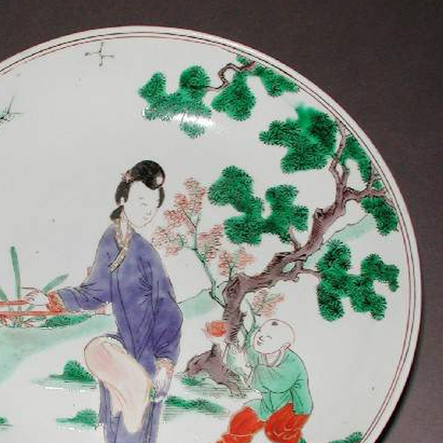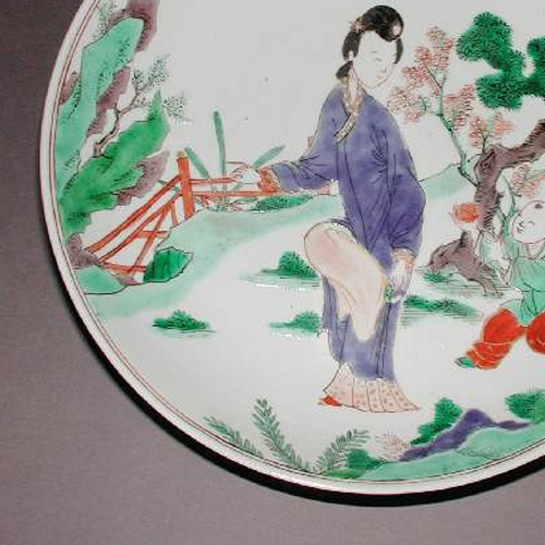 细节:盘心绘有一位身着紫色传统服饰的仕女,身姿优雅,手持物件,似有所思;旁边有一个身着红绿服饰的童子,姿态活泼,仿佛在与仕女互动。周围点缀着葱郁的松树、桥梁、山石等景物,营造出一种宁静而富有生活气息的场景。人物的服饰花纹、面部表情,以及景物的细节都描绘得细致入微,体现了当时工匠高超的绘画技艺。器物表面有一些细微的磨损痕迹,见证了岁月的沧桑。
