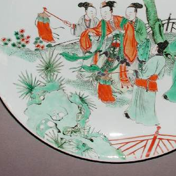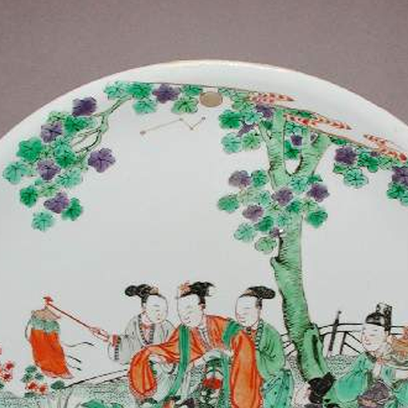 清代康熙至雍正时期,是中国瓷器发展的重要阶段,五彩瓷工艺在前代基础上不断创新。五彩瓷以其色彩浓艳、绘画题材广泛而著称,仕女题材是当时瓷器装饰的常见内容之一。这既反映了当时社会对于女性美的审美观念,也展现了贵族及文人士大夫阶层的生活情趣。同时,清代瓷器大量出口,此类五彩盘不仅在国内备受推崇,也成为传播中国文化和制瓷技艺的重要载体,向世界展示了中国传统艺术的魅力和深厚的文化内涵。