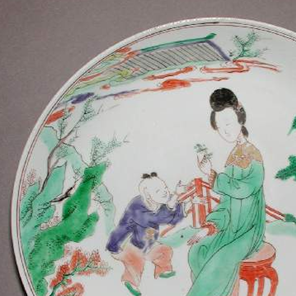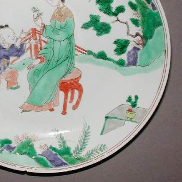 细节:盘心绘有一位身着绿色传统服饰的仕女,神态温婉,坐在红色的凳子上,手中似乎拿着花枝,正与身前的童子互动。童子穿着紫色衣物,姿态活泼,似乎在向仕女讨要手中之物。周围点缀着葱郁的树木、盛开的花卉、古朴的栏杆以及简易的桌案等景物,营造出一种宁静而温馨的生活场景。人物的服饰花纹、面部表情以及景物的轮廓线条都描绘得细致入微,体现了当时工匠高超的绘画技艺。器物表面有一些细微的磨损痕迹和极轻微的裂纹,见证了其沧桑的流传历程。