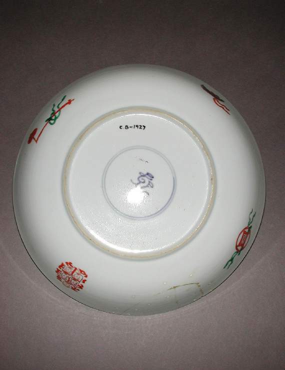 材质与色泽:瓷质细腻,胎体轻薄。盘底施白釉,釉面光洁莹润,为五彩纹饰提供了纯净的底色。五彩色彩丰富,红、绿、蓝、黄等色相互搭配,对比鲜明,历经岁月仍保留着较为鲜艳的色泽,使画面充满生机。