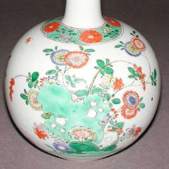 清代康熙至乾隆时期,是中国瓷器发展的鼎盛阶段。在这一时期,制瓷工艺达到了极高的水平,五彩瓷作为重要的瓷器装饰品种,在明代五彩的基础上不断创新发展。当时,宫廷对瓷器的制作极为重视,投入了大量的人力、物力,使得瓷器的造型、纹饰、色彩等方面都精益求精。花卉纹是清代瓷器上常见的装饰题材,寓意美好、繁荣,反映了当时人们对美好生活的向往。同时,清代瓷器大量出口,此类五彩直颈瓶不仅在国内备受推崇,还远销海外,成为传播中国文化和制瓷技艺的重要载体,展示了中国传统瓷器艺术在国际上的影响力。