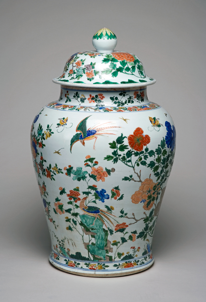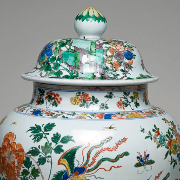 清代康熙至雍正时期,社会相对稳定,经济繁荣,制瓷业得到了极大的发展。五彩瓷在这一时期,无论是颜料的炼制、烧制工艺,还是绘画技法都达到了很高的水平。花鸟纹是清代瓷器上常见的装饰题材,象征着自然的生机与美好,反映了当时人们对生活的热爱和对自然的崇尚。同时,清代瓷器大量出口,此类五彩盖罐作为中国传统文化的载体,远销海外,促进了中外文化的交流与传播。