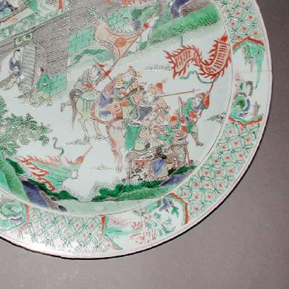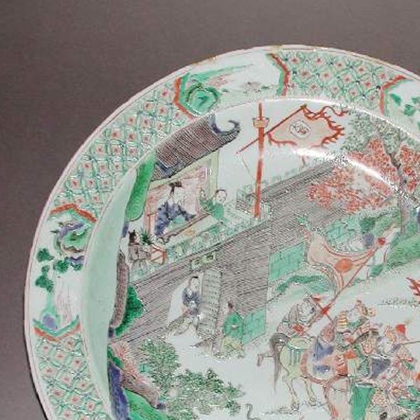 清代康熙 - 乾隆时期,是中国瓷器发展的黄金时代,制瓷工艺达到了登峰造极的水平。五彩瓷在明代五彩的基础上进一步发展,颜料配方更加成熟,烧制工艺更加精湛,绘画技法也更加多样。人物故事题材的瓷器纹饰在当时十分流行,多取材于历史故事、神话传说、戏曲小说等,不仅具有装饰性,还承载着丰富的文化内涵,反映了当时社会的文化生活、价值观念和审美情趣。同时,清代瓷器大量出口,此类五彩大盘作为中国传统文化的重要载体,远销海外,让世界领略到中国瓷器艺术的独特魅力和深厚的文化底蕴,在中外文化交流中扮演了重要角色。