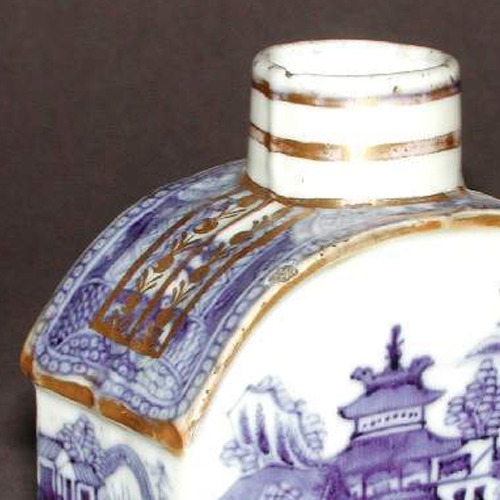 细节:壶身绘有精美的楼阁山水图案,亭台楼阁错落有致,有的高耸于山间,有的静立在水边,周围点缀着葱郁的树木、蜿蜒的溪流以及缭绕的云雾,仿佛一幅展开的山水画卷。青花的笔触细腻,将楼阁的结构、树木的枝叶都描绘得细致入微。描金工艺则用于勾勒楼阁的轮廓、门窗等部分,使图案更具立体感和层次感。壶口边缘和壶身的转角处也有描金装饰线条,增强了器物的装饰效果。器物表面有一些细微的磨损痕迹和描金部分的脱落现象,见证了其坎坷的流传历程。