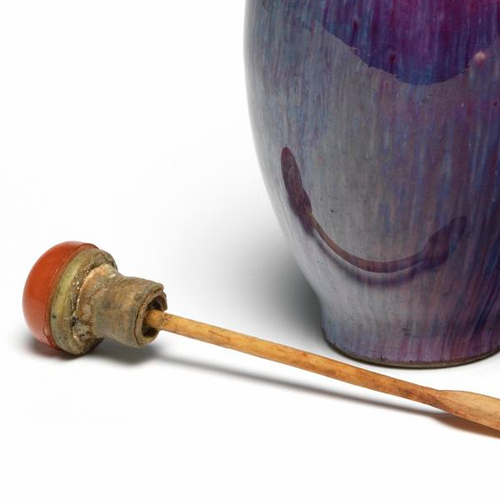 细节:瓶口边缘釉色稍薄,露出淡淡的胎色。壶身釉面光滑莹润,在光线照射下闪烁着柔和的光泽。从不同角度观察,釉色的层次感和变幻效果更为明显。木质塞子打磨光滑,与瓶口紧密结合,保证了鼻烟壶的密封性 。