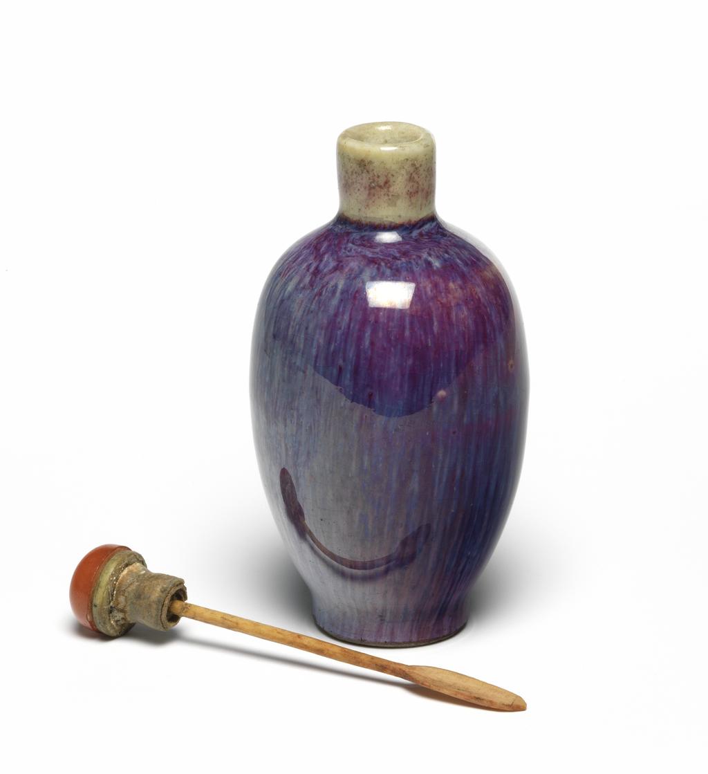 清代乾隆 - 嘉庆时期,社会相对稳定,经济繁荣,制瓷业持续发展,达到了很高的水平。窑变釉是在瓷器烧制过程中,由于釉料的配方和窑内气氛的变化,产生的一种自然的釉色变异现象,具有不可预测性和独特的艺术效果。鼻烟壶在当时是流行的随身物品,深受文人士大夫和贵族阶层的喜爱,其制作工艺多样,材质丰富。窑变釉鼻烟壶不仅是实用的容器,更是兼具观赏和收藏价值的工艺品,反映了当时高超的制瓷技艺和人们对美的追求。同时,这一时期中外交流增多,中国的瓷器等工艺品大量出口,传播了中国的文化和制瓷技术。