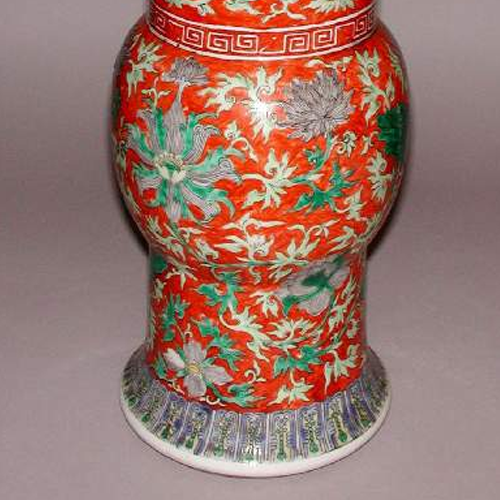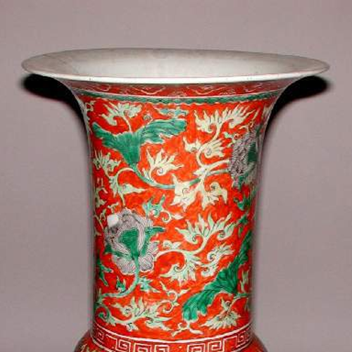 清代康熙时期,社会相对稳定,经济繁荣,制瓷业在明代的基础上达到了新的高度。康熙五彩是在明代五彩瓷器的基础上发展而来,其工艺更加精湛,色彩运用更加丰富大胆。红地五彩瓷器是康熙五彩中的一个重要品类,以鲜艳的红彩为地,搭配其他色彩的纹饰,视觉冲击力强。花卉纹作为中国传统瓷器装饰中常见的题材,象征着美好与繁荣,在康熙时期的瓷器上被广泛应用。凤尾尊这种器型在康熙朝颇为流行,常作为陈设器摆放在贵族和富绅家中,既体现了主人的身份地位,也展示了当时高超的制瓷工艺和独特的审美情趣。