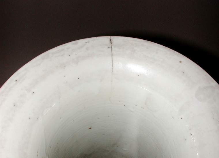材质与色泽:瓷质细腻,胎体厚重坚实。以白色釉为底,外部施红彩为地,红彩鲜艳浓烈,如同燃烧的火焰。其上以绿彩、灰彩等绘制花卉纹,色彩对比鲜明,富有层次感。白釉内壁光洁,虽有细微黑点和一条裂痕,但无损其整体美感。