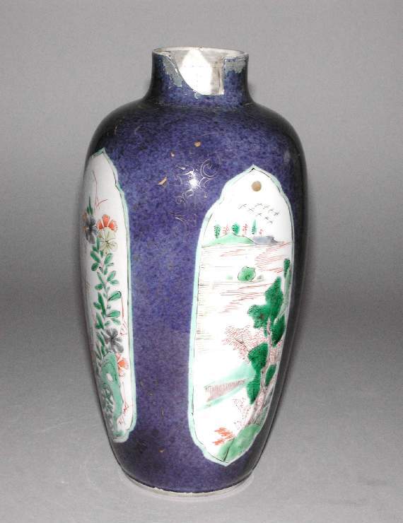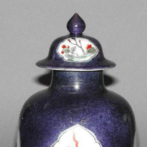 细节:罐体有多处开光,开光内分别绘有花卉和山水图案。花卉图中,花朵形态各异,枝叶舒展,色彩搭配和谐,展现出自然的生机与活力;山水图里,山峦起伏,树木葱郁,江水悠悠,画面富有层次感,仿佛能让人感受到大自然的宁静与壮美。紫地上还隐约可见一些金色的暗纹,虽历经岁月有些模糊,但仍能看出工艺的精细。器物表面有明显的破损痕迹,尤其是口沿和盖部,见证了其流传过程中的沧桑。